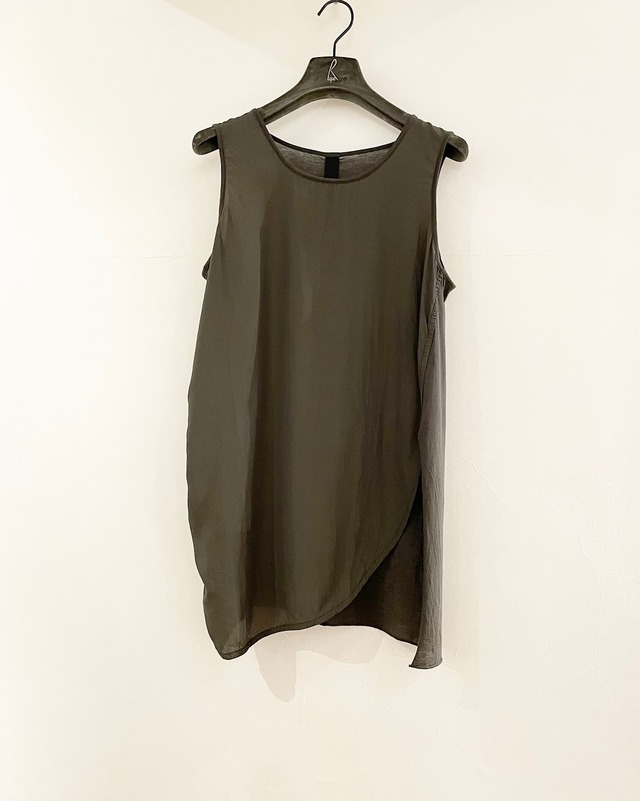 ROQUE by ILARIA NISTRI ノースリーブトップス 2006年 イラリア ニストリ& シモーネ ラファネリ『イラリア ニストリ』を設立。 積極的な最新テクノロジーの採用、上質な素材の追求、常識に捉われないフォルム、イタリアならではの職人技術による「伝統とモダン」な要素をバランスよく取り入れたアイテムを展開 2010S/Sシーズンよりジャージを多く取り入れた新ライン『ロッケ イラリア ニストリ』Roque ILARIA NISTRIをスタート ノースリーブトップス フロント左サイドセンターから斜めにラウンドカットされたROQUEらしいアバンギャルドデザイン。前見頃はキュプラ素材、後身頃が肌触りの良いコットン素材になっております。 インナーとしても、アウターとしても活躍する アイテムです。 サイズ : M カラー : ダークカーキ 素材 : キュプラ100% 前見頃 素材 : コットン100% 後身頃 総丈 : 69cm 肩幅 : 32cm 身幅 : 47cm お譲りする品は画像の品になります。 当画像参照のうえ購入をご検討ください。 一点物なので画像でしっかり確認をし納得の上ご購入をお願い致します。