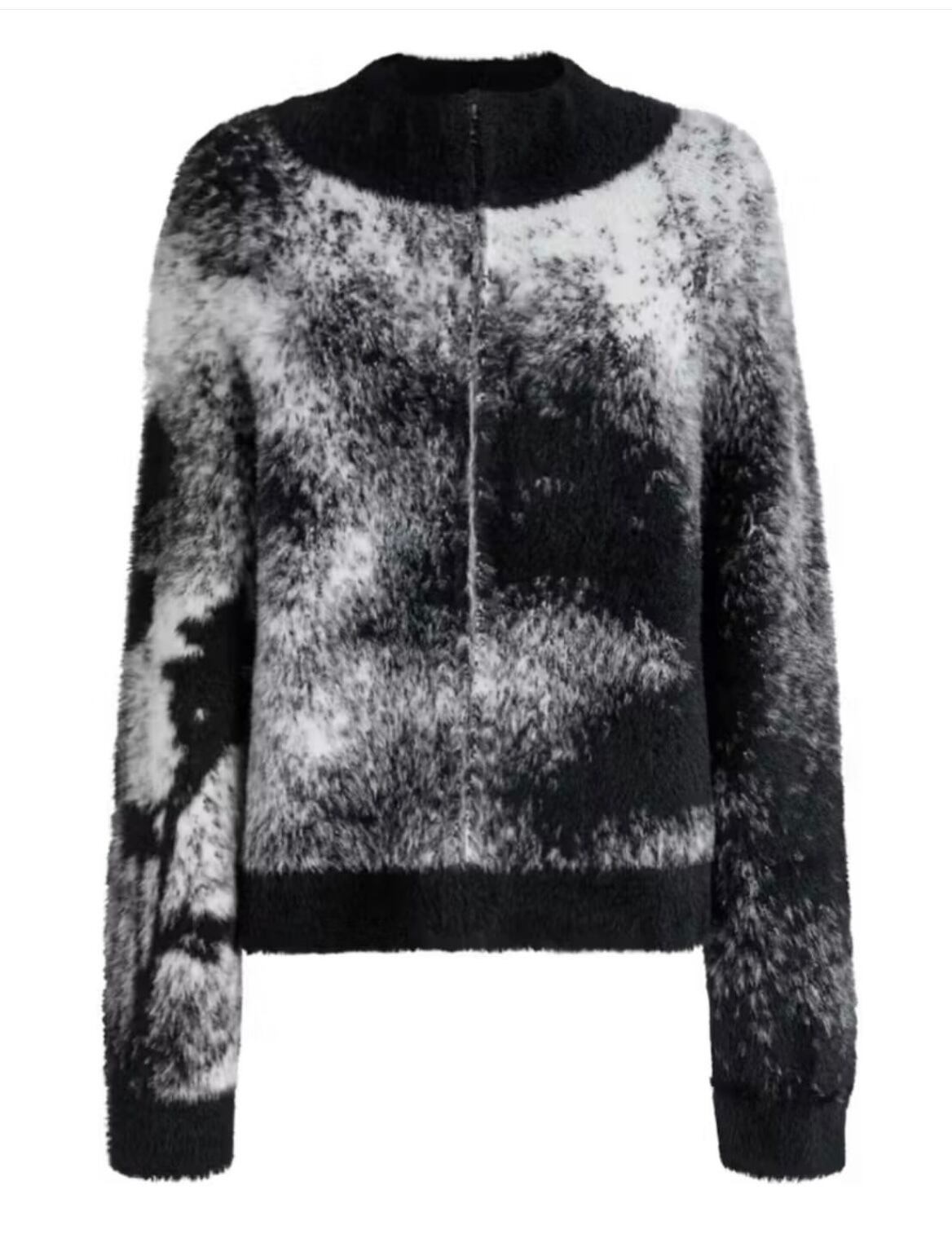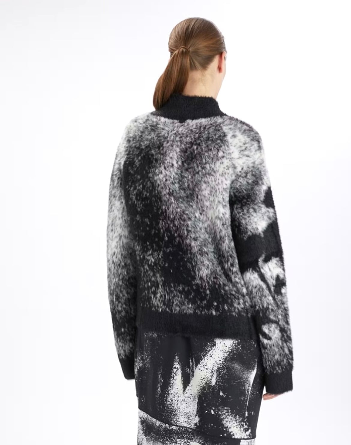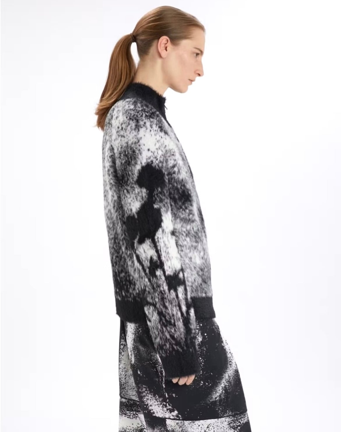 右袖の花柄モチーフが繊細なアクセントを添え、無地のリブ襟、袖口、裾がデザインをエレガントに引き立てます