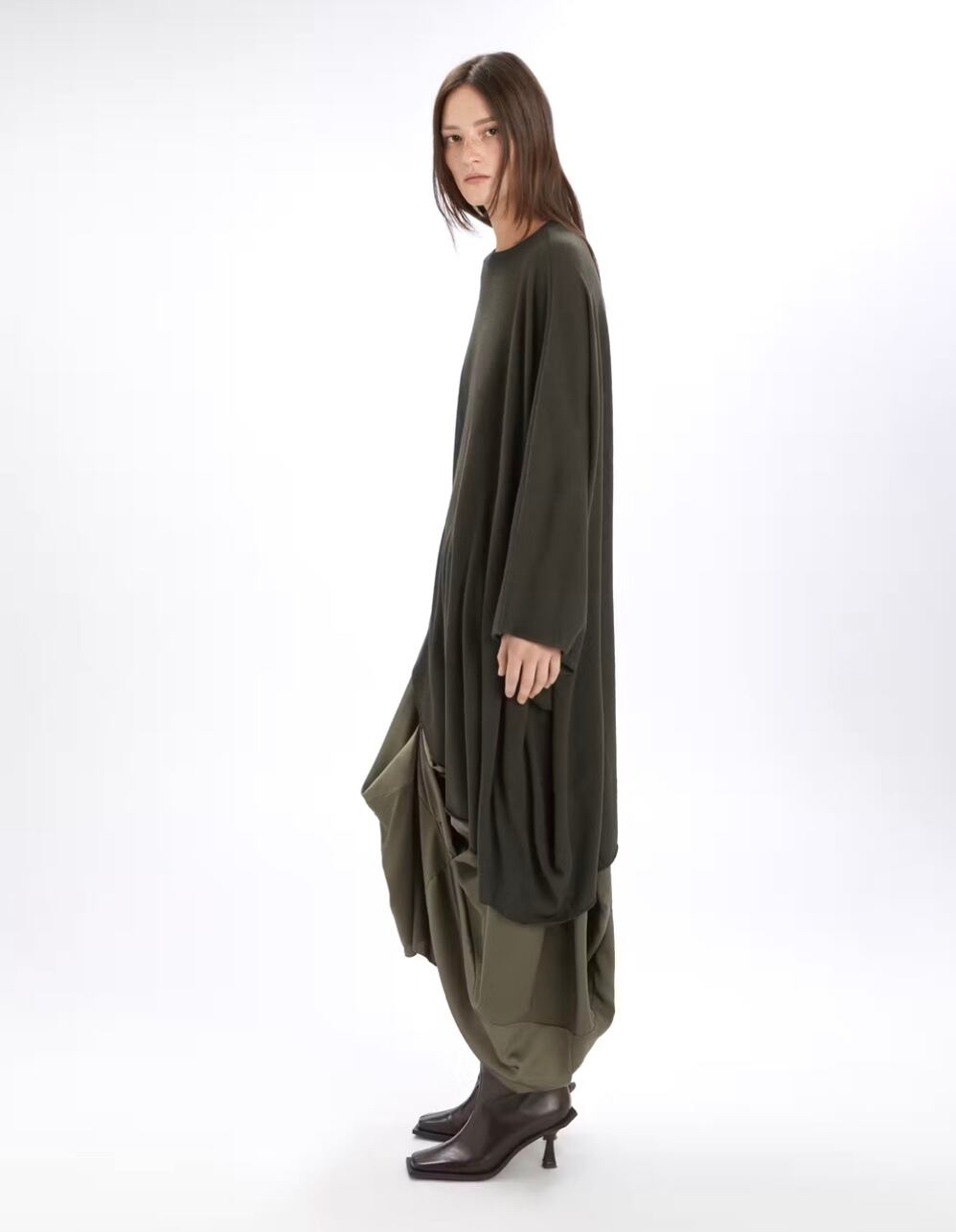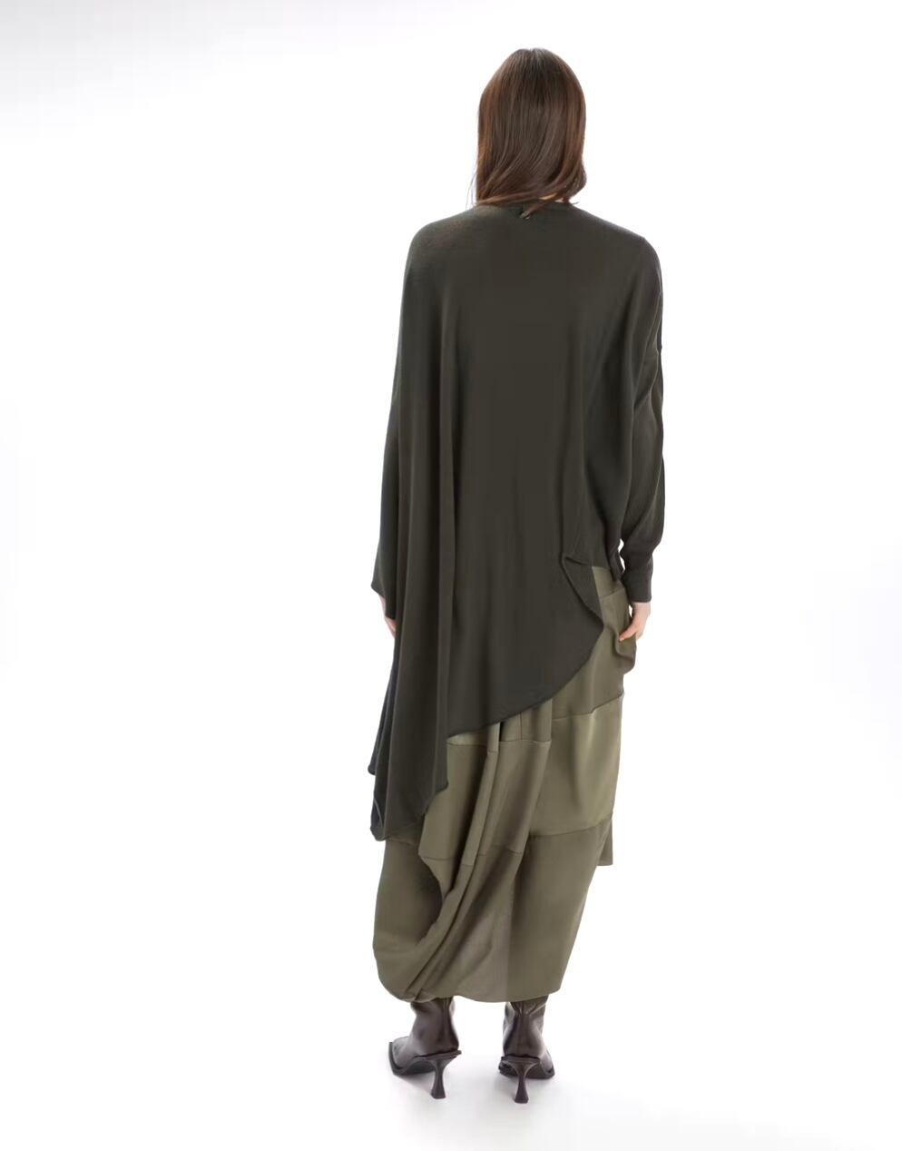 ヒップから左の膝下まで続くアシンメトリーカットが特徴の、軽やかで流れるようなウール混紡のチュニックセーター。大胆でありながら洗練された印象を与えます。