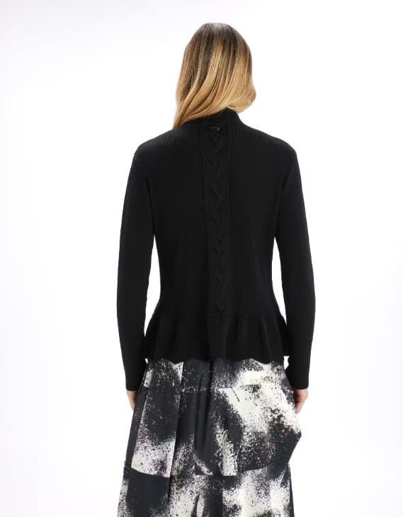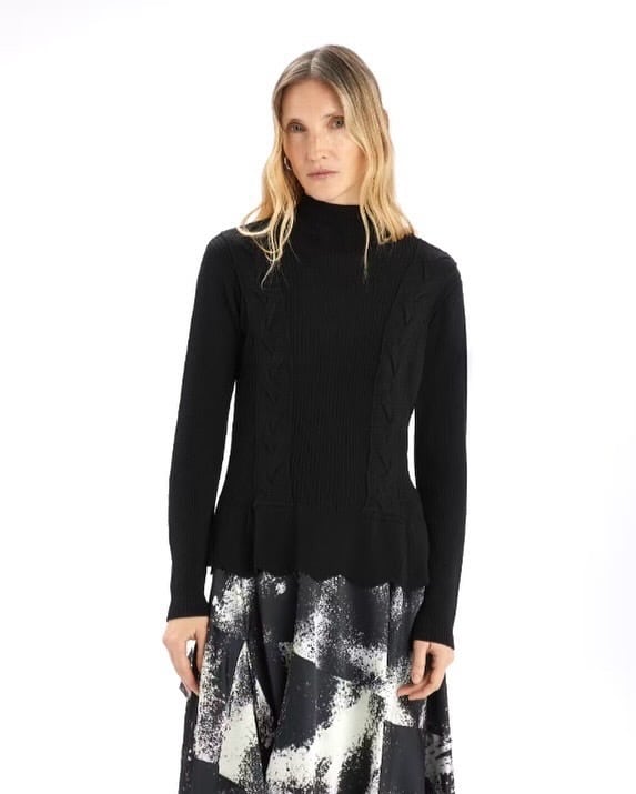 スリムなシルエットに、裾に施されたフェミニンな扇形のパターンがアクセントになっています。フロントとバックに大胆なケーブル編みを施し、流れるようなプロポーションの遊び心を生み出しています。スタンドカラーにはリブトリムをあしらいました。袖はリブ編みの長袖。フロントとバックにケーブル編みのディテールを施し、裾には扇形のモチーフ。