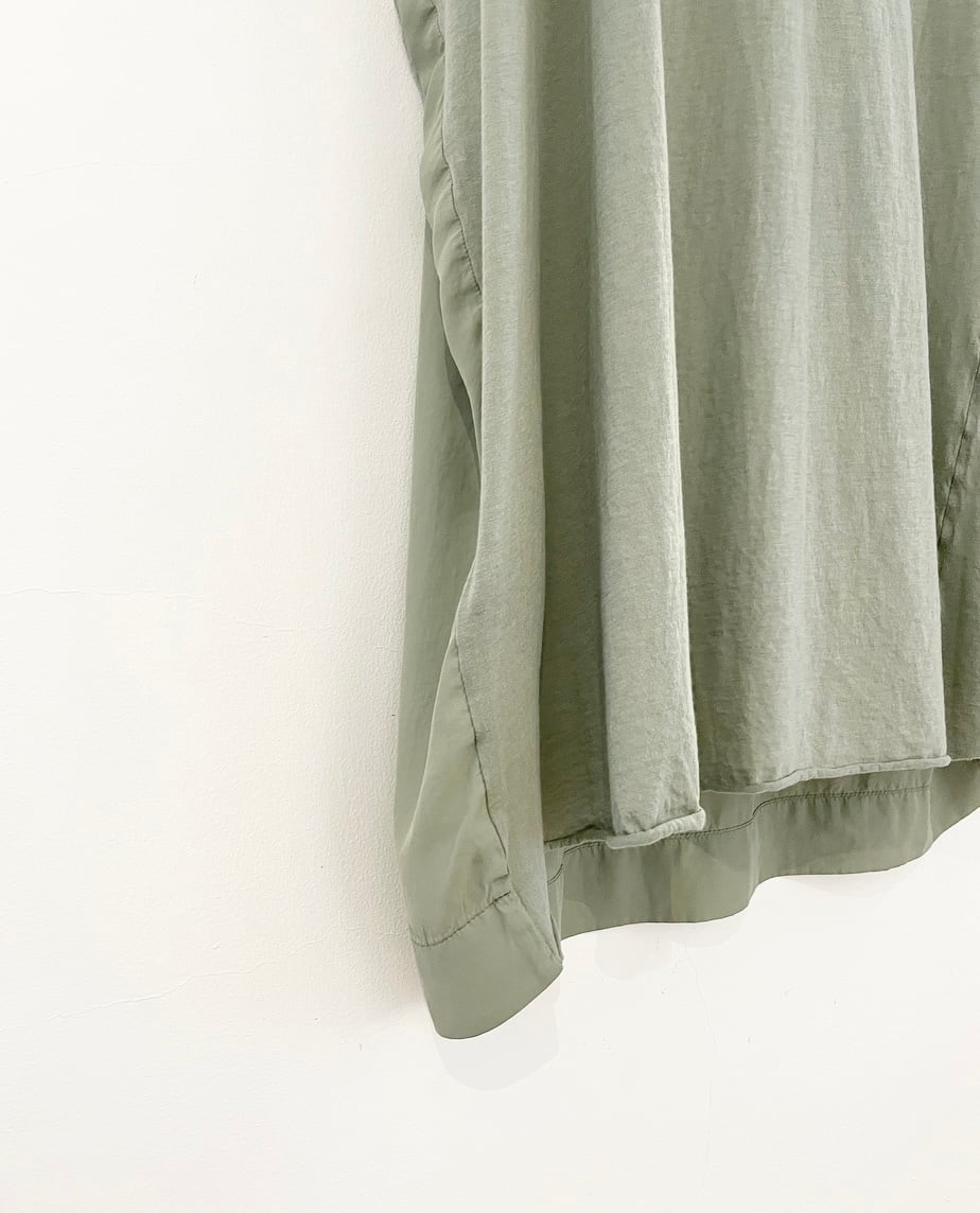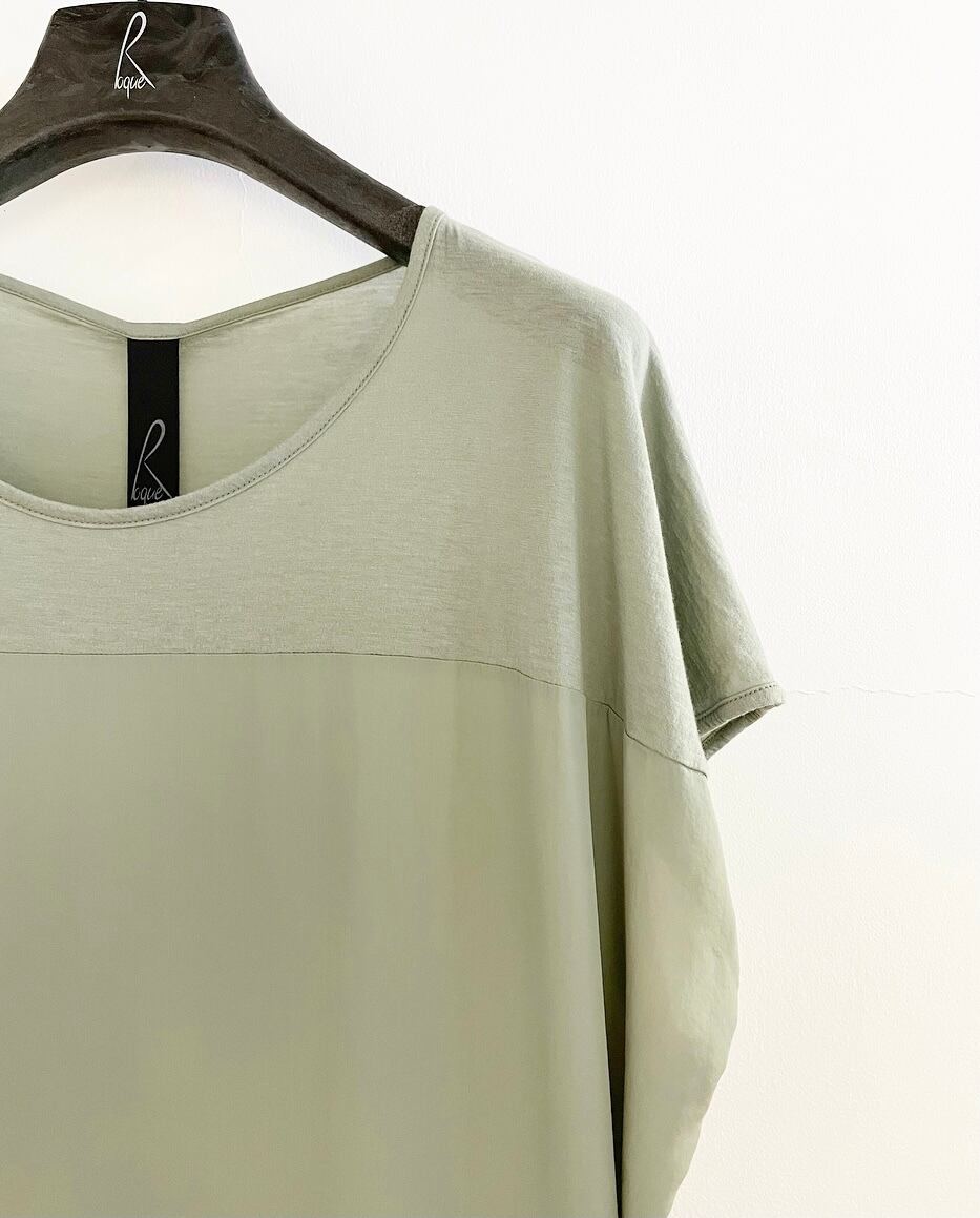 右肩と胸からアシメ切替になっておりROQUEらしいアバンギャルドデザイン。前見頃別布はキュプラ素材、後身頃とフロント一部が肌触りの良いコットン素材になっております。