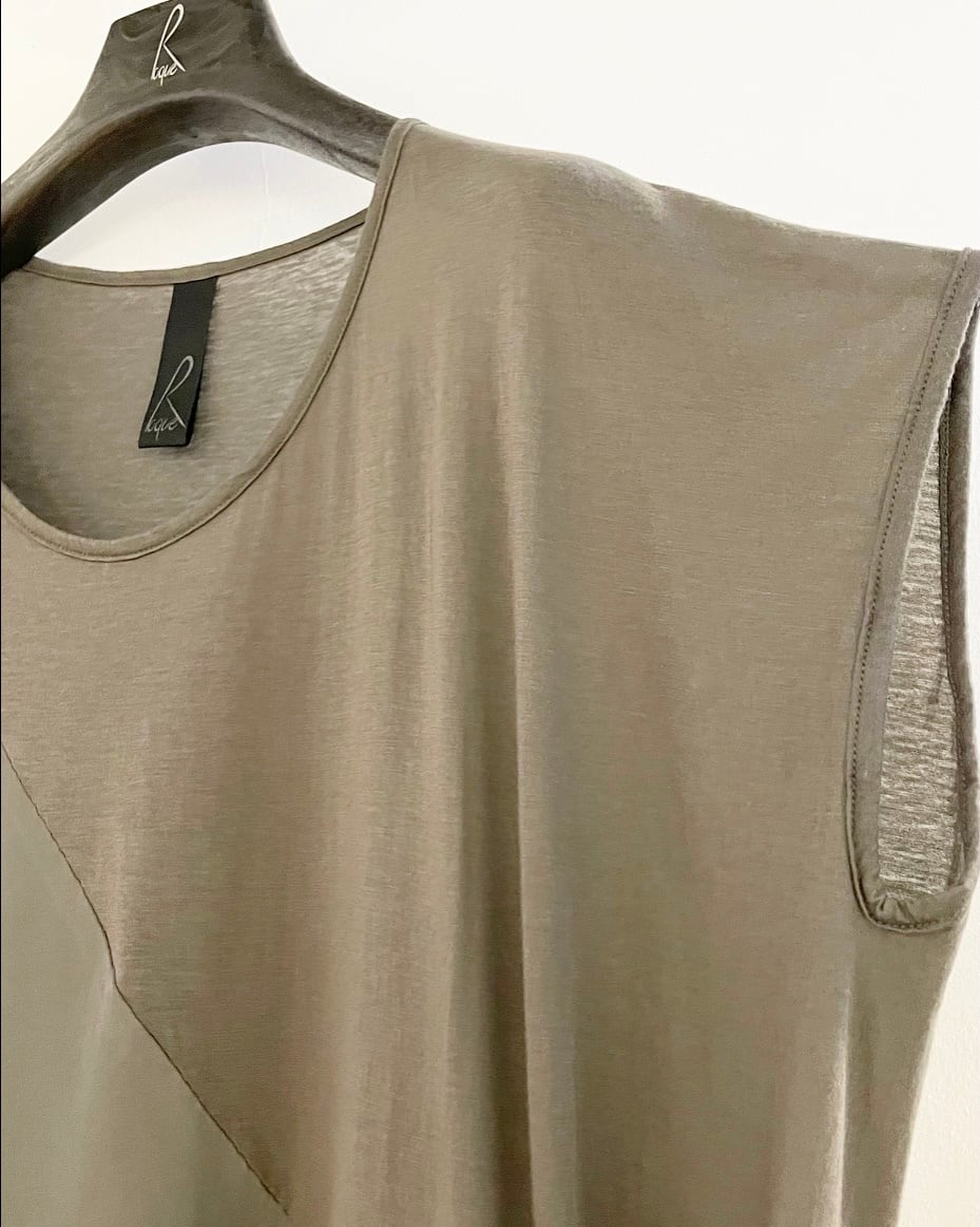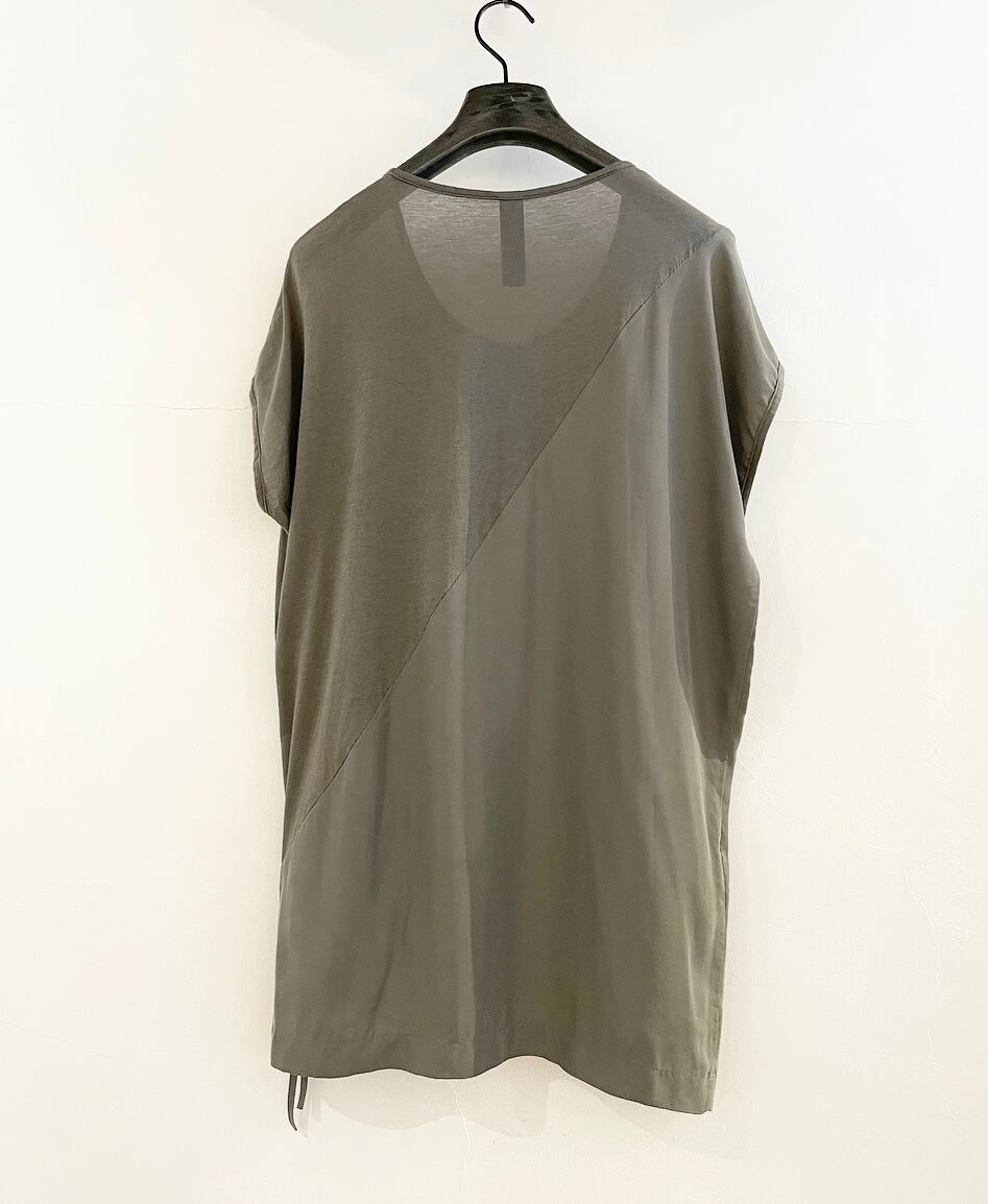 右肩から斜めにアシメ切替になっており、裾上13cmの位置からZIPが付いていて広がるデザインがアクセントになるROQUEらしいアバンギャルドな造りに。右側前後はレーヨン × キュプラ素材、左側前後が肌触りの良いコットン素材になっております。インナーとしてもアウターとしても活躍するアイテムです