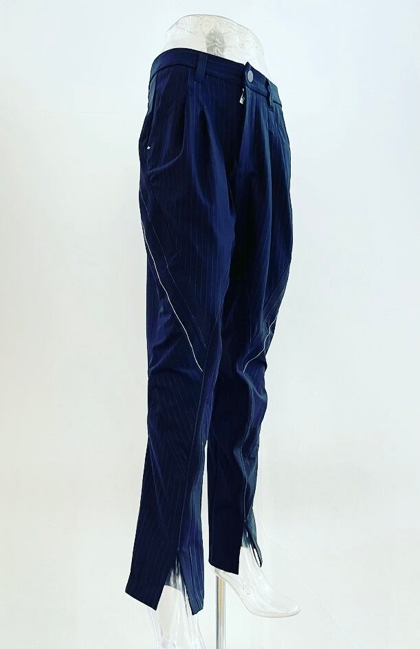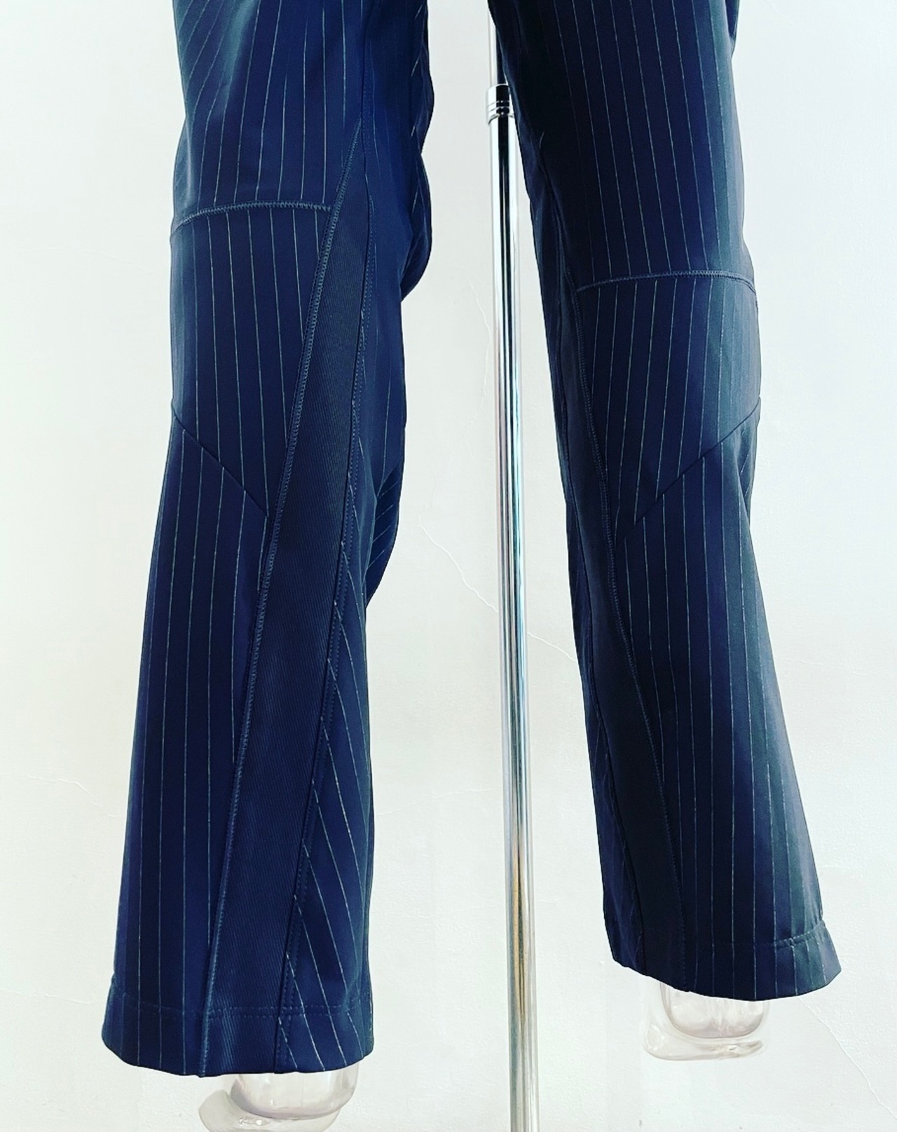 メイン素材はラメストライプストレッチを使用し、フロントは筋肉に沿ったV字切替にリブストレッチをバイアスに使っています。裾はV字カット。バックヨークと膝裏から裾までにもリブストレッチ素材を使用。HIGHの得意なエルゴノミックデザインのストレッチパンツです。